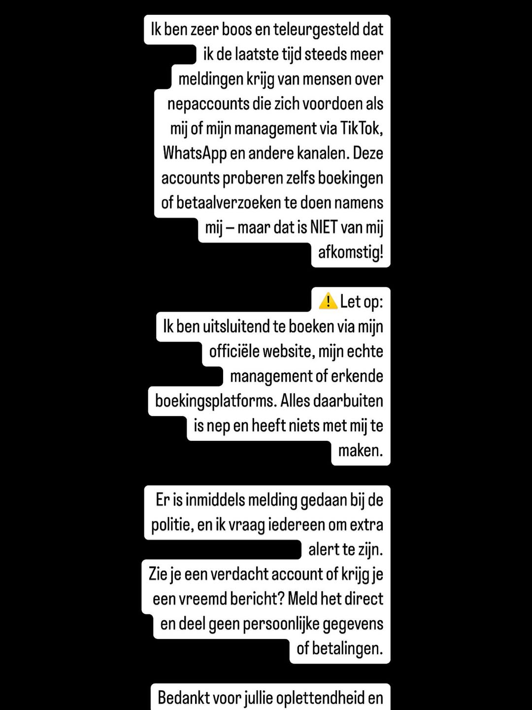 De zanger laat weten dat hij niet alleen spreekt vanuit persoonlijke ervaring, maar ook namens anderen die met dezelfde problemen kampen. “Het baart me zorgen dat niet alleen ik, maar ook anderen zich inmiddels regelmatig moeten verdedigen tegen nepbeelden, valse profielen en misleidende berichten,” vertelt hij.